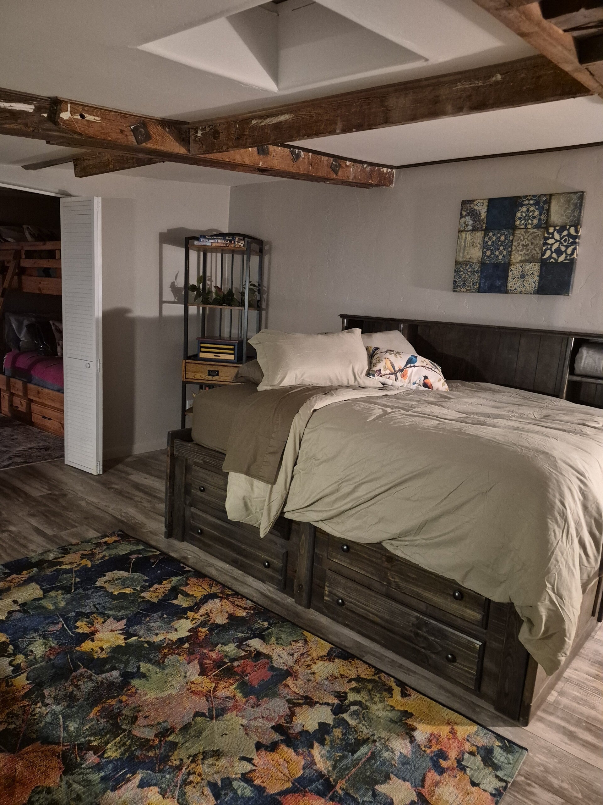 Step inside The Bunkhouse and find a perfect blend of rustic charm and modern comfort. Our unique bedrooms are thoughtfully situated in the loft, offering spectacular views to the south and east. Downstairs, you'll discover a cozy dining room, an efficient kitchen perfect for light meals, and a spacious bathroom featuring a refreshing rain-shower. And for those tranquil evenings, unwind on the, covered 'cowboy' porch.